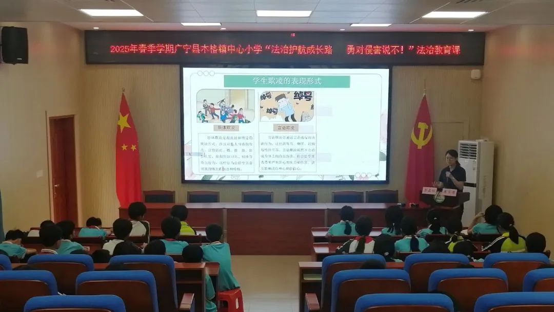 近日,广宁县木格镇中心小学举行“法治护航成长路 勇对侵害说不”2025年春季学期专题法治宣讲活动。以法治之光照亮成长之路,让每位同学都能挺直脊梁,向侵害坚决说“不”。